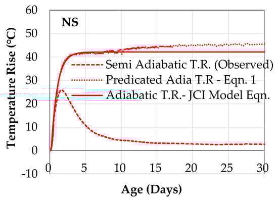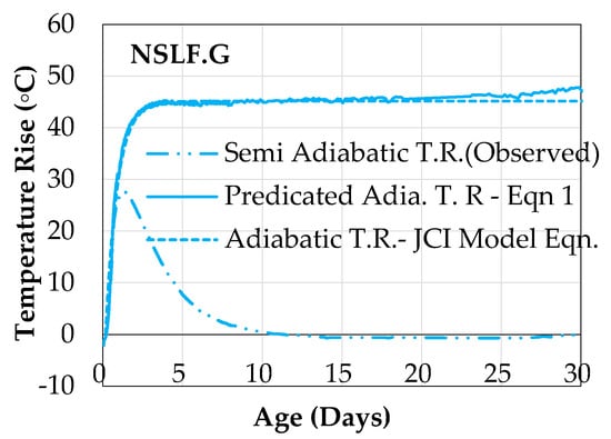 Cement hydration in concrete is an exothermic reaction and causes temperature rise in concrete. This property is responsible for thermal cracking in concrete members and has an influence on shrinkage properties. Generally, there is a relationship between the extent of rise in temperature on the type and content of cementitious materials in concrete. To establish the general behavior of this concrete property, temperature rise, due to cement hydration in semi-adiabatic condition, was conducted on NS and NSLF.G containing S3000. This also enabled a check of the effect of adding limestone powder and fine gypsum on rise in concrete temperature. The results are shown in Figure 4a,b. The results were, then, used to predict adiabatic temperature rise of concrete using Equation (1). This equation is based on a simple thermal insulation test on the relationship between semi-adiabatic temperature rise and adiabatic temperature rise, proposed from previous research [32].