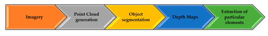 There are challenges to the acquisition of these types of data sets and then also with regards to the processing power required to analyze them. To this end, this study focuses on the use of a low-cost image acquisition pipeline using mobile phones. Mobile imagery data has an advantage over drone data in that higher resolutions can be yielded given that distance to the object is smaller and also surveys can be made in areas where drone use is forbidden. When coupled with the SfM techniques, mobile imagery can be utilized to create point clouds of a distress and these point clouds can be segmented without excessive processing power. Point clouds have previously been classified to produce depth maps and smaller more useful models within the original model in other fields of study [37]. Generally, the process can function as depicted in Figure 2.