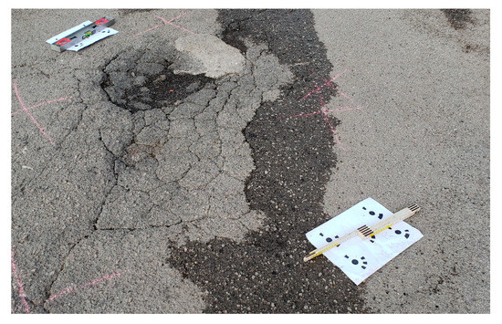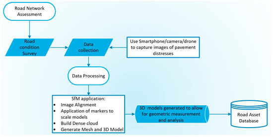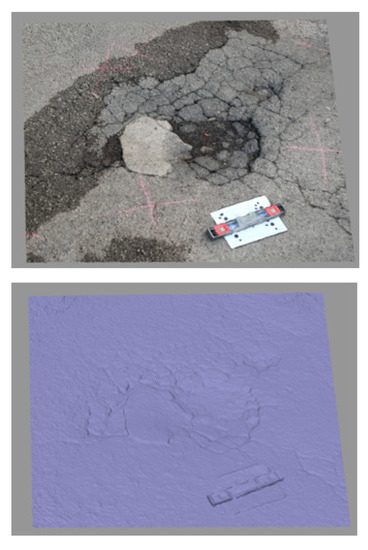 Structure-from-motion (SfM) is a photogrammetric modelling technique utilized to replicate 3D models of objects. It is a low-cost method that employs the use of algorithms to reconstruct the object using simple 2D imagery [21]. Within the technique, overlapping images are typically taken around the object at different angles. Specific algorithms for image alignment and bundle adjustment are then applied to establish the object’s position in three-dimensional space [22]. Figure 1 showcases an example of a dataset obtained across a distressed asphaltic pavement section.