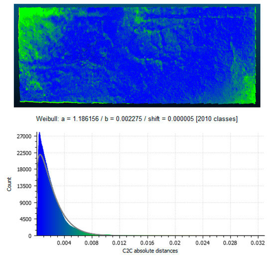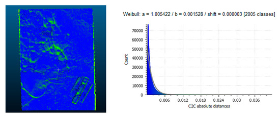 For a metric evaluation of the differences between models generated by the mobile phones and those generated by a professional camera, a statistical evaluation of the measured geometric differences between the models was done utilizing the Weibull distribution. The Weibull distribution is a continuous probability distribution and it was applied as it is typically used in reliability analyses and used to determine the accuracies of structure-from-motion models [43]. The distribution is defined by the probability density function given in Equation (2) below.