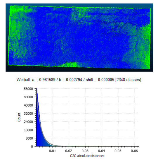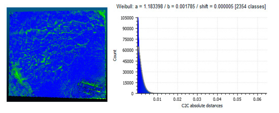 After the models were replicated using the SfM pipeline, they were then imported into CloudCompare, which is a software designed to analyze 3D models and point clouds. In the software, the models derived by the mobile imagery were aligned with the models derived by the camera. This alignment was done utilizing common points between the models so as to create a scenario where the two models are effectively overlapped at the correct points. Once the alignment was complete the distances between them were measured using a metric called C2C (Cloud to Cloud) absolute distance. This measurement produces a visualization of the measured differences across the model’s surface. This visualization is also color coded with a color range of blue to red with blue highlighting smaller differences and red highlighting larger ones. From these differences, a histogram can be plotted illustrating the differences. Using the differences illustrated, the Weibull distribution was also applied to determine the Weibull parameters of shape and scale in order to have a statistical metric understanding of the differences.