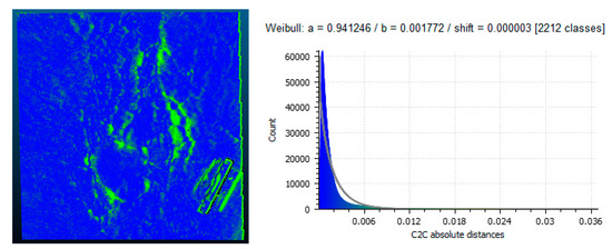 For the second section, the visualized differences along with the plotted distribution and Weibull plot are shown in Figure 16 and Figure 17. The Weibull shape and scale parameters are also given in Table 6. For this section, the values for the scale were again less than 0.003 m (3 mm). The value of the shape parameter was again close to 1 which once more signifies that within the distribution it is more likely that the majority of the values will occur early in the plot. This helps to reinforce the validity of the methodology for a different section, this one with depressions and cracking. The visualizations for these two comparisons showed that the most change occurred along the crack but also in the interior of the depression present in the section.