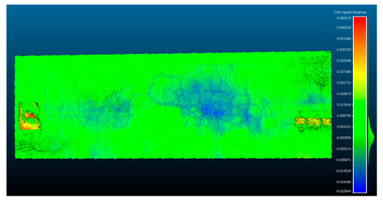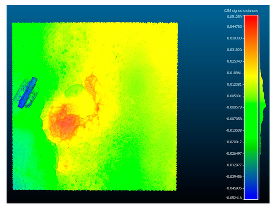 Once this plane was adequately assigned a distance computation between the plane mesh and the point cloud was done utilizing the C2M distance computation in CloudCompare to produce a depth map for each distress. The C2M distances represent the depths and filtering this can result in the segmentation of the model. This is illustrated in Figure 22, Figure 23 and Figure 24.