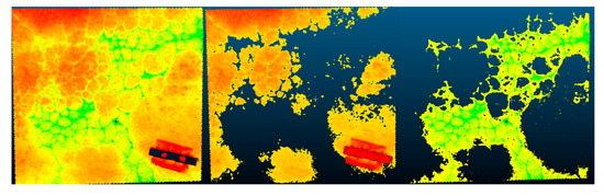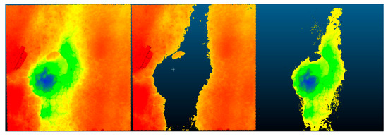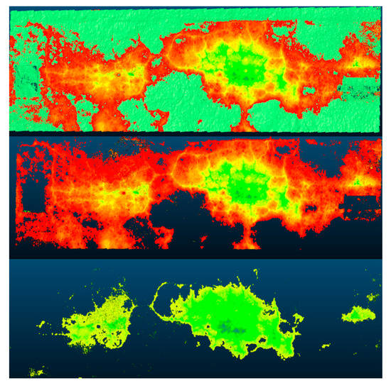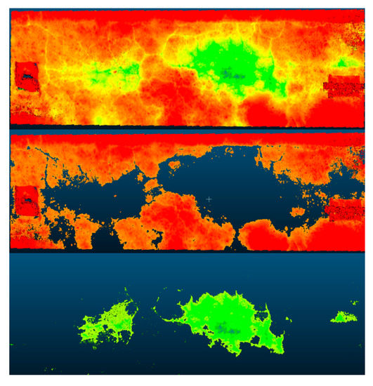 These depth maps now allow filtering to be done by depth and section and allow the model to be segmented for the sections to be analyzed. This is easily done by controlling the range of the depth map and this is illustrated in Figure 25, Figure 26 and Figure 27. From the current segmentation result, the process can detect typical distresses where there is a change in surface deviation of the pavement. As the major groups of pavements distresses are cracking distresses and visco-plastic deformations (which both feature this type of deviation), this process and segmentation can account for most distresses. Visco-plastic deformations include bumps, sagging, rutting, corrugations, depressions, potholes, swelling, lane and shoulder drop off, shoving, and stripping. In Figure 25, Figure 26 and Figure 27, the depth maps for the pavement sections are shown at three different levels of segmentation. In the first image, the entire section is visualized with the hotspots of the distressed sections highlighted. Given that in this depth map one can see the particular points of interest, the depth map was then further segmented to remove the parts of the pavement without distress by using a smaller range on the depth map values. The final image of the three further adjusts the range of the depth map to then only illustrate the distressed section with the deepest distress. In Figure 25, the third image highlights the section suffering from not only cracking but also a significant depression. The same process was carried out for each section and the visualizations are shown in Figure 26 and Figure 27 also follow the same methodology to allow visualization of the exact points of distress and to isolate these sections. In Figure 26, the exact section suffering from a pothole is isolated and in Figure 27, the exact section suffering from excessive cracking is isolated. The exact metric evaluation of the distress is not shown within the study as the metric evaluation of 3D models derived from SfM processes has been previously validated using laser equipment to verify the metric accuracy of the models to determine the closeness of the results from those measured within the field [20,27]. The semantic color choice of the depth map is up to the user for the visualizations, in terms of which colors signify positive or negative deviations. Once this segmentation is done, metric assessments of the segmented portion can be found such as the area and volume of the segmented region which can either be the section that is distressed or the section that is not. By doing this, a ratio of the distressed section to non-distressed section can be established and inserted into the asset database for the road authorities, which is critical for establishing appropriate pavement management strategies. These critiques are possible as all of the models are scaled and the previous sections have established the metric accuracy of these scaled models. The dimensional analysis of the sections was not carried out as the determination of the methodology to arrive at a position at which this type of analysis is possible was more important to the discussion of the study and the research. Additionally features such as the depressed section and the crack section be filtered by simply changing the range of the depth map as shown in the images. From this segmentation, a differentiation of the types of distresses occurring can be made as well as the particular features of the distress can be more easily identified as the depth maps shown in Figure 25, Figure 26 and Figure 27 establish isolation of sections that have related features. At this point, the user would be able to identify the particular distress type. This will provide a road agency with exact measurements of the distress which can be utilized for severity assessment and to trigger times for maintenance and rehabilitation interventions.