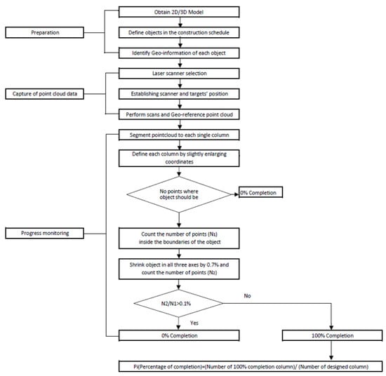 Progress in the total project is calculated by comparing the number of built columns and the number of planned columns in different scans, as shown in Equation (2).