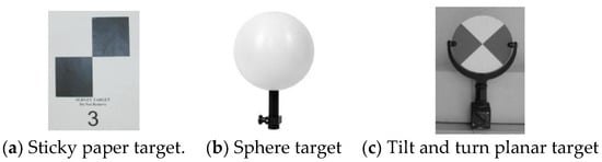 In the original 3D design, each object has its location information. In order to define each object in the point clouds, the data should be in the same coordinate system. Targets are used to adjust, geo-reference, and combine different scans together in the registration step. A target can be stuck on a surface (Figure 2a), a spherical target shown in Figure 2b can be mounted on a pole, or a tilt-and-turn planar target shown in Figure 2c can be installed.