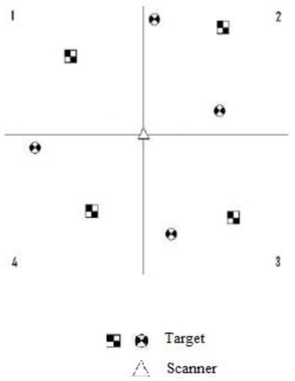The setup of the targets is important as they directly influence the accuracy of the registration. This process is necessary to combine individual scans together. The targets should be placed evenly throughout the scan area, as shown in Figure 3. With at least one target in each quadrant, targets should be placed at different elevations and at the recommended optimal distance from the scanner according to the scanners’ manual.