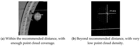 Different laser scanning targets are designed for different distances. They should be scanned within the specified distance in order to get enough density to pinpoint their centers for registration purposes. A good target should have enough point cloud coverage, and the center of the target should be clearly shown, as in Figure 4a. If the distance from the scanner to the target exceeds the manufacturer’s recommended distance, it is hard to pinpoint the center of the target, as shown in Figure 4b, creating serious errors during registration.