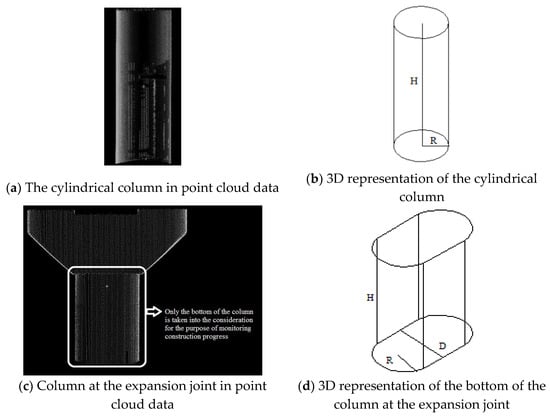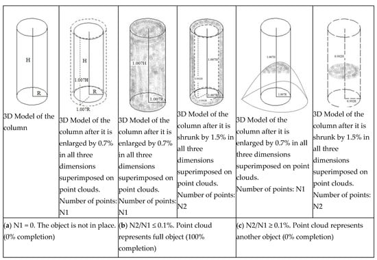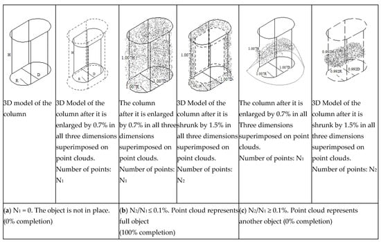 After the object is shrunk by 1.5%, if N1/N2 ≤ 0.1%, the column is considered to be 100% complete. If N1/N2 > 0.1%, then it is concluded that the point clouds have nothing to do with the object, the percentage of completion of the column is 0%. The principle to determine if the point cloud data represent an object was developed in the study performed by Zhang and Arditi [], and is shown in Figure 6 for a cylindrical column, and in Figure 7 for a column at an expansion joint.