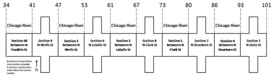 In total, there were 68 bents with 261 columns. Please note that, in some areas such as Section 6 (N. LaSalle Street), many columns belonged to the Chicago Riverwalk, which is an open pedestrian waterfront located on the south bank of the Chicago River. Those columns were excluded from this research. To simplify the schedule and make it easy to explain, a simple schedule was established, as shown in Figure 9. The construction order followed the section numbers. For example, Section 1 (N. State Street) was the first section constructed.