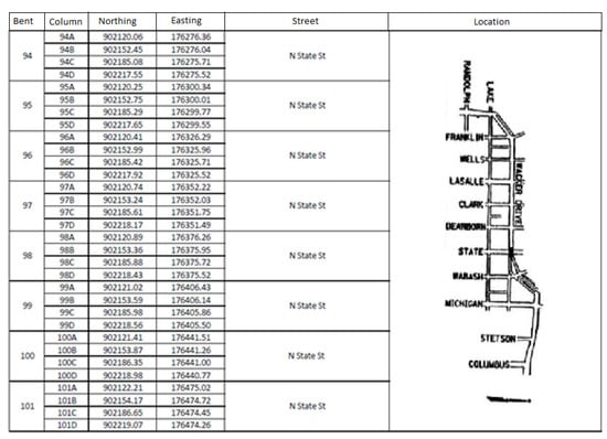 From earlier preliminary survey information, each column was geo-referenced by using the project’s coordinate system. The geo-reference information of the columns in N. State Street is presented as an example in Figure 10. The labeling method used in the original design was also used in the research, starting from bent 34 to bent 101 in the west-east direction, row A to row D in the south-north direction.
