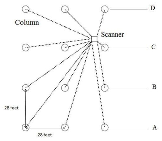 In this project, the longest span among each section is 225 feet, and the shortest span is 175 feet. The average distance between two adjacent columns is 28 feet. Based on the preliminary construction schedule, three or four scans were scheduled for each section, and each scan was designed to have maximum coverage of three bents with a total of 12 columns. The scanner was typically set up in the location shown in Figure 12 to have full coverage of the objects’ surface and to avoid occlusions.