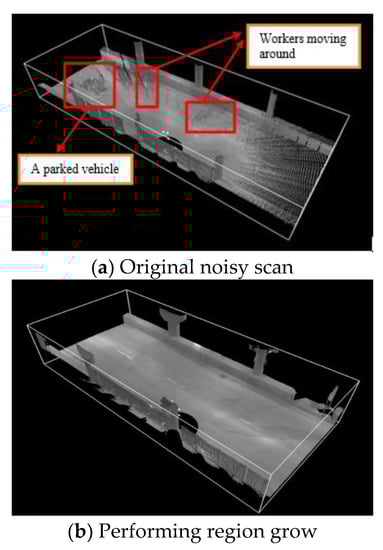 The scans were named Scan1, Scan 2, and Scan 3. Each scan was set up to have full coverage of the columns. There was no large construction equipment such as trucks and shovels on the construction site during the scanning of the area because scans were performed in the late evening or early morning. Only a portion of a small vehicle and few workers were captured by the scanner. As columns were typically 10 ft high, there was no full occlusion of any column. Two operations had to be performed to measure progress. First, due to the conditions on the site, the range of the laser beam was limited to only 100 ft (30 m), although the scanner can reach up to 1000 ft (300 m). The reason for choosing 100 ft (30 m) was because the scanner was located such that it had enough coverage of no more than three bents, i.e., up to 100 ft (30 m). By limiting the range of the laser beam to 100 ft (30 m), it was possible to eliminate useless data in the scans, hence avoiding handling a very large amount of point cloud data. Second, the “region grow” technique was used to reduce the noise in the data and smooth out the information about the pavement. Figure 15a shows the original scan with the noisy data caused by workers moving around and a parked vehicle. In Figure 15b, the region grow parameters were defined to control the thickness of the pavement, the level of detail, and the size of the region. Figure 15c shows the results of the “region grow” process with a clear view of the pavement.