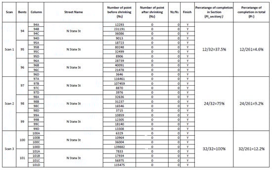 There were a total of 32 columns in Section 1, and after three scans were performed, the system detected 32 columns that were in place; progress in Section 1 was 32/32 = 100%, and progress in the entire project was 12.2%, as shown in Figure 16. As can be seen in Figure 16, the number of points before shrinking (N1) and the number of points after shrinking (N2) are recorded for each column as well as the ratio N2/N1. If the column is defined as a constructed column by the program, then Y (Yes) is marked in the last column. If not, then N (No) is marked. This process was applied to all ten sections for all 261 columns.
