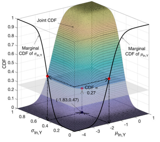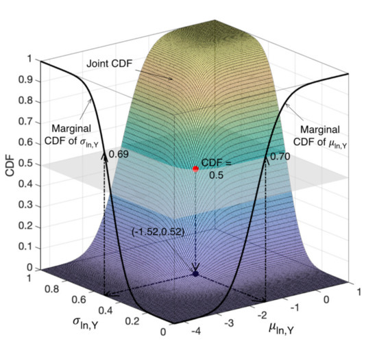 The method proposed by Cavalieri and Franchin (2019) [12] is flawed. In fact, the fractile chosen for the parameters on their respective marginal distributions does not correspond to the same fractile of the joint distribution, which is the actual target. For illustrative purposes, this is illustrated with reference to an example including only the first two correlated fragility parameters used in the application (see Section 3.2), related to the yield limit state fragility curve, namely, μln,Y and σln,Y. Taking only two parameters over a set of four correlated parameters allows the joint CDF to be visualised in a 3D plot. In particular, only the first two columns in Table 1 and the first 2 × 2 submatrix in Table 2 are considered for this example (the description of such tables is given in Section 3.2). First, the extreme values of μln,Y and σln,Y, extracted from a large sample of parameter values obtained from their marginal normal distributions, were used for a discretisation of the parameter supports, thus building a grid of points. Then, the joint CDF was evaluated at such grid points, as displayed in Figure 1. The latter shows the process of deriving the fractile of the joint distribution corresponding to a given fractile of the two parameters, according to the method proposed in [12]. For simplicity, and without loss of generality, the 50% fractile is considered, leading to the retrieval of only one set of parameter values, extracted from their marginal unconditional distributions (the set and marginal CDFs are shown in the figure). Figure 1 clearly shows that the 50% fractile of both parameters corresponds to the 27% fractile (black dot) of the joint distribution, which is thus quite different from the desired (target) 50% fractile. This shortcoming may occur, of course, also in the case of parameter fractiles different from 50%, when one parameter is fixed and the other one is extracted from the conditional distribution (see procedure outlined above).