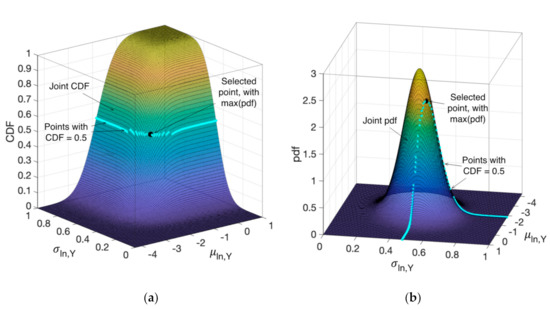 Figure 2. Example showing the selection of the 50% fractile of the joint distribution, according to the approach proposed herein. (a) 50% fractile (black dot) as one of the points with joint CDF = 0.5 (cyan dots); (b) 50% fractile (black dot) selected as the one that maximises the joint pdf. - Among the extracted points, the desired fractile of the joint distribution is selected as the one with the highest value of the joint pdf, as shown with a black dot in Figure 2b. The same selected point is also shown in Figure 2a. The selected set of values is the most likely parameter set; as such, it is not supposed to lead to extreme combinations of values and, in the case of fragility parameters, to intersection of fragility curves related to different limit states.