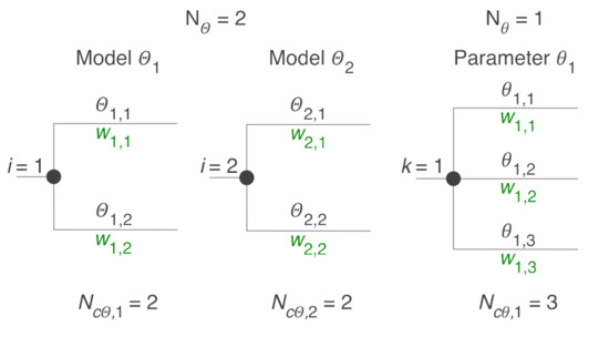 In Equation (4), NcΘ,i and Ncθ,k are the numbers of choices for the i-th model and the k-th parameter, respectively, xn is the MAF or performance metric value corresponding to the n-th branch of the tree, formed from the sequence j(1), …, j(NΘ) of models and m(1), …, m(Nθ) of parameter values, while wn is the associated weight. It is noted that the final weights wn, as well as all other weights within each module, are “reliability weights”, as opposed to “frequency weights”, therefore they sum up to unity: