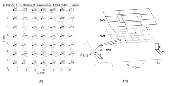 The synthetic city used as case-study. (a) Sketch of the realistic gas network with multiple pressure levels; (b) the gas network together with the building and hazard layers.