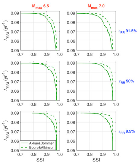The subplots in Figure 7 show twelve λ-curves of SSI, obtained from different combinations of choices in the first three modules, concerning Mmax, the GMPE and both variables in the GAS fragility model. An important feature characterising this application is that the highest attainable value of SSI, corresponding to the reference undamaged conditions and called here SSI0, results in being lower than 1, and in particular, 0.976. This effect owes to the pressure-driven mode adopted in the flow formulation, combined with the assigned pressure levels and thresholds in the network (see [13,14]). As a result, several node loads are reduced even in non-seismic conditions, yielding a SSI0 value lower than 1. Looking at the curves, it is possible to see the amount of epistemic uncertainty in the output and also qualitatively assess its sensitivity to the considered modules. It is noted that the maximum magnitude practically does not affect the curves, while the influence of the residuals and especially the GMPE is more evident. In particular, the upper fractiles for cause the λ-curves to be slightly shifted towards lower exceedance rates for SSI values, as expected, whilst in all cases the Akkar and Bommer (2010) [52] GMPE leads to more severe λ-curves of SSI, laying below the ones related to the Boore and Atkinson (2008) [53] model.
