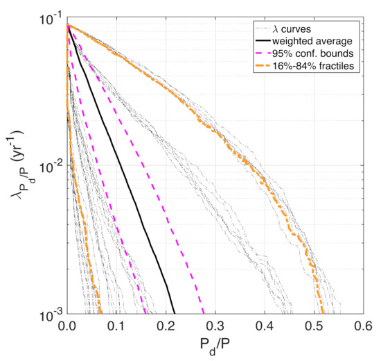 Figure 8 shows the MAF curves of the displaced population normalised to the total population, Pd/P. The λ-curves shown are 36, as the number of simulations carried out. Each curve corresponds to a single branch of the logic tree and quantifies the aleatory uncertainty contained in the employed models and parameters, whilst the spread of the curves around the average gives a clear indication of the epistemic uncertainty. As a consequence, the distribution of Pd/P corresponding to the full suite of curves captures both aleatory and epistemic uncertainties (Bommer and Scherbaum, 2008) [8]. Figure 8 displays the weighted average curve of Pd/P (for fixed MAF values), as well as the 95% confidence bounds and 16% and 84% weighted fractile curves. In fact, while the confidence in the estimate increases with the number of simulations, N, thus leading the confidence interval to reduce, the weighted fractiles are only a function of the sampled values.