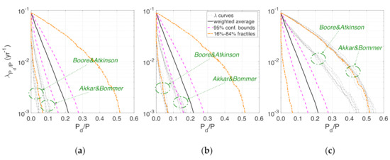To gain qualitative insight into the sensitivity of uncertainty in the final output (i.e., the MAF of Pd/P) to the input modules, the subplots in Figure 9 show a disaggregation of the total epistemic uncertainty according to the fractiles of the RC fragility distribution, and following the same order of subplots in Figure 6. Thus, subplots (a), (b) and (c) show the λ-curves obtained by fixing the RC fragility distribution at 91.5%, 50% and 8.5% fractiles, respectively. The curves appear to be clearly grouped into clusters, related to the considered fractiles: naturally, the higher the fractile, the lower the estimated number of displaced people. The similarity of the 50% and 91.5% fractile fragility curves (see Figure 6a,b) leads to two almost overlapped clusters (in Figure 9a,b). In each subplot, two further clusters of curves, related to the two adopted GMPEs, can be identified. In particular, as already seen for SSI, the Akkar and Bommer (2010) [52] GMPE leads to more severe λ-curves of Pd/P, laying on the right of the ones related to the Boore and Atkinson (2008) [53] model. The other two modules, namely, Mmax and , do not cause clustering of curves, and therefore are deemed to contribute less to output epistemic uncertainty.