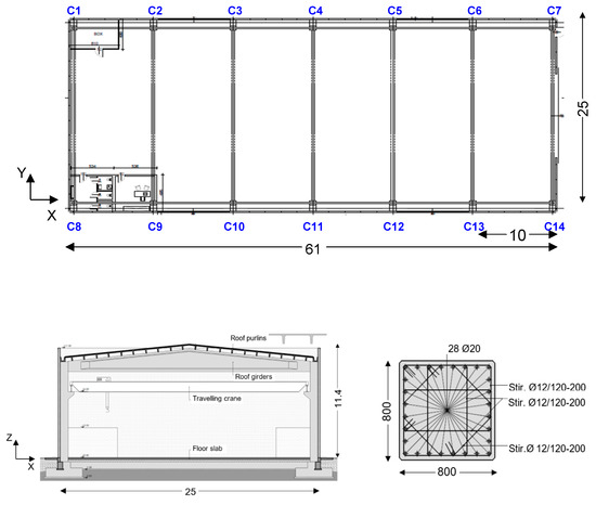 According to the prescriptions of Italian Standards [8], the traditional seismic design solution of the building was carried out by assuming a behavior factor q = 2.5, corresponding to ductility class “B” for this structural typology. The plan and a section of the building are illustrated in Figure 1. The structure is composed of 14 R/C prefab columns, with height of 10.6 m and cross section shown in the same figure, and seven pre-stressed R/C girders, with net span of 24.2 m. The roof is made of pre-stressed R/C purlins, over which a supplementary R/C slab is cast. The concrete and the steel used for the columns are class 45/55 and B450C, respectively. The foundation footings are linked to columns by a set of steel connectors guaranteeing a mutual monolithic joint, and have sides of 3700 mm, bottom flange height of 900 mm, and total height of 1500 mm. The cladding panels have pinned-type slotted connections to the columns. Further details on the structural system are reported in [7].