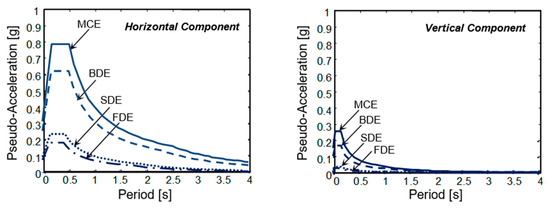 Like for the traditional anti-seismic solution recalled in the previous Section, the two advanced protection designs were carried out for the four reference seismic levels fixed in the Italian Standards [8], that is, frequent design earthquake (FDE), serviceability design earthquake (SDE), basic design earthquake (BDE) and maximum considered earthquake (MCE), having 81%, 63%, 10% and 5% probabilities of being exceeded over the reference time period, fixed at 50 years. The assumed topographic category is T1 (i.e., flat surface), and soil is C-type (medium-dense sand). Relevant elastic pseudo-acceleration response spectra are graphed in Figure 2. Time–history analyses were developed by assuming artificial ground motions as inputs, generated in families of seven from the spectra above, both for the horizontal components and the vertical one.