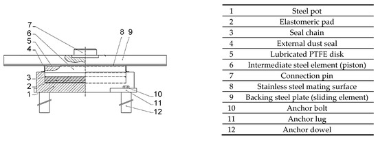 The roof isolation system is made of steel-PTFE multi-directional flat sliding bearings, of the same type as the ones usually installed in base isolation systems [9,10,11,12,13,14,15,16], placed on top of columns. The cross section and the constituting components of the devices are shown and listed in Figure 3.