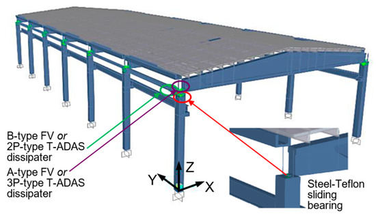 The finite element model of the structure, shown in Figure 4, was generated by SAP2000NL software [18]. In this image, the positions of the two types of dissipaters alternatively adopted as protective devices are also highlighted, in addition to the positions of the steel-PTFE sliders.