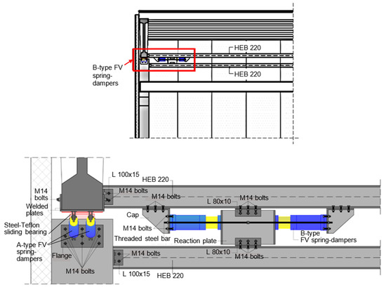 As illustrated by the drawings in Figure 5 and Figure 6, the dissipaters are always installed in pairs, and namely: with in-parallel diagonal layout at the 14 girder-to-column connections, in the X–Z vertical plan (A-type FV spring-dampers, 28 in total); with in-series horizontal layout at both ends of two HEB 220 steel beams linking the column top sections and the base “bulbs” of the girders, per each longitudinal side of the building, in the Y–Z vertical plan (B-type, eight in total).
