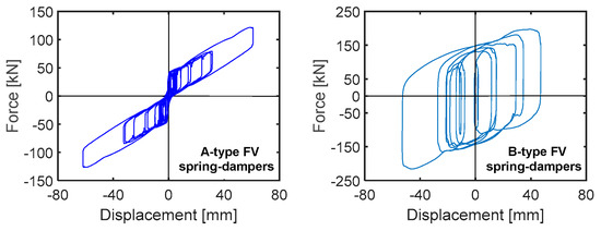 Response cycles of the most stressed A-type and B-type FV spring-damper pairs obtained from the most demanding MCE-scaled group of input accelerograms.