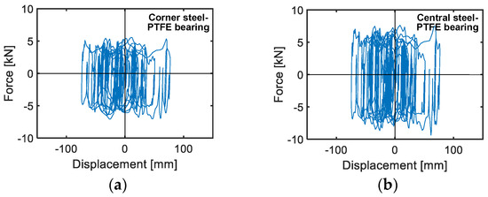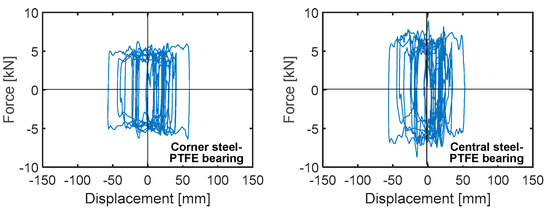 The response cycles in X direction of the most stressed steel-PTFE isolators situated on top of one corner column and one central column, graphed in Figure 8, highlight similar maximum displacements, equal to 58.9 mm and 53.2 mm, respectively. This underlines very low torsional response effects of the building in plan. Both peak values are far below the isolator displacement capacity of ±100 mm.
