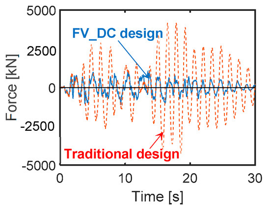 The base shear time-histories in X direction, along which a slightly higher response is computed as compared to Y (due to the slightly higher total translational stiffness obtained along X axis), plotted in Figure 9, show a reduction factor of about 4.1 for the FV dissipative connection-based design (denoted as FV_DC in the graph) in comparison to the conventional one. This determines an elastic response of columns up to the MCE, as targeted for this design.