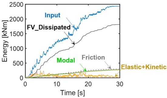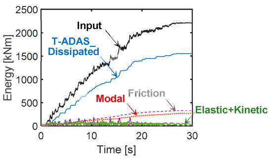 The energy time-histories plotted in Figure 10, computed in output by the SAP2000 software according to the classical Uang-Bertero energy equation [34] (where modal energy represents the term associated with the linear viscous damping matrix of the structural system), demonstrate that the energy dissipated by the FV devices, equal to 74.3% of the input energy, nearly coincides with the targeted 75%.