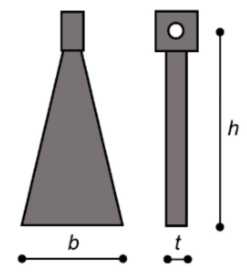 T-ADAS dampers consist in the assembly of isosceles triangle-shaped steel plates vertically mounted on top of the supporting diagonal braces [35,36,37,38,39]. According to the symbols in Figure 11, the following typical dimensions of the plates were adopted [29,36,37]: h = 150 mm, t = 15 mm, and b = 150 mm. The constituting steel is S 450 type, with yielding stress, fy, of 450 MPa, and ultimate stress, ft, of 690 MPa.