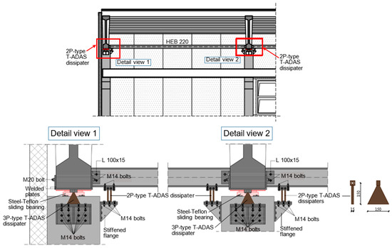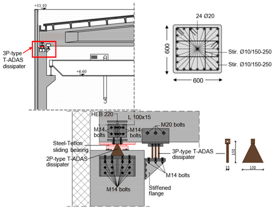 Detailed drawings concerning the installation of the T-ADAS dampers are shown in Figure 12 and Figure 13. The column sections resulting from the design analysis, displayed in Figure 12, as well as the foundation footings, are the same as for the FV dissipative connection solution.