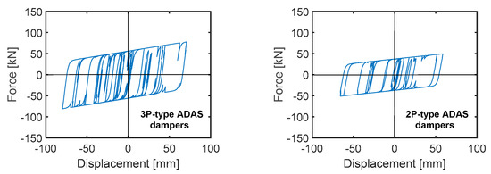 Response cycles of the most stressed 3P-type and 2P-type T-ADAS dissipaters obtained from the most demanding MCE-scaled group of input accelerograms.
