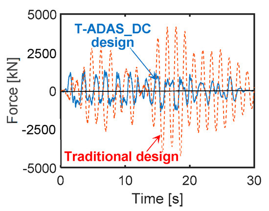 The base shear time-histories in X direction, plotted in Figure 16, identify a slightly lower reduction factor when passing from the traditional to the T-ADAS dissipative connection-based design (denoted as T-ADAS_DC), as compared to the FV-based one, i.e., equal to 3.55 instead of 4.1. This is due to the slightly higher stiffness of the steel dampers and, consequently, of the structural system. Nonetheless, a completely elastic response of all structural members up to the MCE is obtained in this case too.