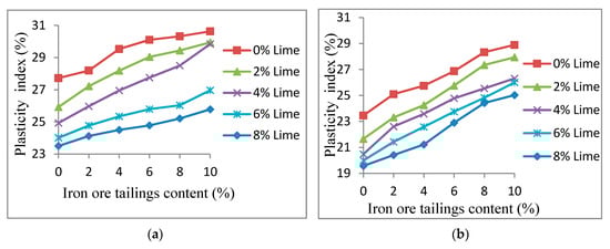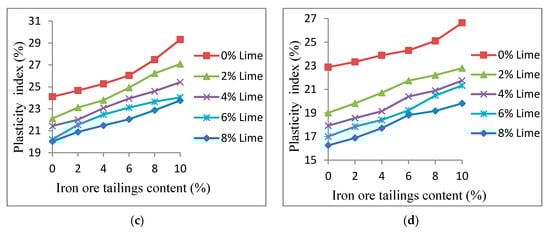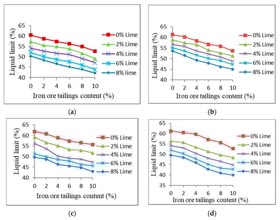 The variation of LL of BCS–lime mixtures with IOT content is presented in Figure 1a–d. The LL of BCS–lime–IOT mixtures decreased with an increase in the lime and IOT contents. This may be attributed to the decrease in the silt and clay fractions because of agglomeration and flocculation of the particles. This could be linked to cation exchange reactions whereby Ca2+ in IOT and lime reacted with lower valence ions present in the clay structure [,,]. The addition of lime and IOT introduced Ca2+ needed for strength which triggered a decrease in the repulsive force of the soil mixture, thus requiring additional water for the soil to reach its dynamic shear strength []. In other words, calcium ions (Ca2+) and hydroxides (OH-) produced by the addition of lime to the soil water system combined with silica (Si) and alumina (Al) in the clay fraction to form calcium silicate hydrates and calcium aluminate hydrates []. The experimental studies reported in the literature [,,,] generally showed that inclusion of lime to clay soils reduces the LL. A similar trend was reported by Phani Kumar and Sharma [].