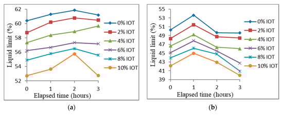 The effect of elapsed time after mixing on the liquid limit of BCS–lime–IOT mixtures for the optimally treated soil (i.e., BCS–8% lime and up to 10% IOT) is shown in Figure 2a,b. The LL of specimens increased between 0 and 1 h elapsed time after mixing. However, for BCS–0% lime mixed with up to 10% IOT, the LL values increased for delays up to 2 h before decreasing. In the case of optimal BCS–8% lime mixed with up to 10% IOT, LL decreased after 1 h delay. The recorded decrease may be associated with the creation of coarser aggregate and additional flocculated particle arrangement associated with increasing calcium for strength with elapsed time and consequent requirement for water to bring the soil to its dynamic strength [].