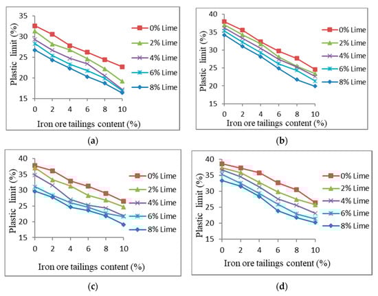 The variation of plastic limit (PL) of BCS–lime–IOT mixtures at 0–3 h elapsed time after mixing is shown in Figure 3a–d. Generally, the PL of BCS decreased with an increase in lime and IOT content. The PL of BCS–8% lime–10% IOT mixture decreased from 32.6% to 16.4%; from 38% to 19.9%; from 37.8% to 19.1%; and from 38.6% to 20.2% for 0–2 and 3 h elapsed time after mixing, respectively. A similar trend was reported by researchers [,,,,,]. The decrease in PL might not be unconnected with the cation exchange reaction along with flocculation–agglomeration of clay particles from the addition of the additives.