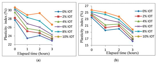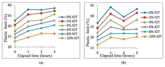The variation of PL with elapsed time for BCS–0% lime–up to 10% IOT mixtures and optimal BCS–8% lime–up to 10% IOT mixtures is shown in Figure 4a,b. There was a general increase in PL for up to 3 h elapsed time after mixing for 0% lime–up to 10% IOT treatment while for the optimal 8% lime–up to 10% IOT treatment, a decrease was observed after 1 h. PL values of 32.6, 38.0, 37.8, and 38.6 were obtained for 0–2 and 3 h, respectively, for 0% IOT/0% lime. In the case of 0% IOT/8% lime treatment, PL values of 26.7, 34.4, 29.6, and 33.3 were recorded for the period of 0–2 and 3 h, respectively. Similar trends were observed for the remaining percentages of lime and IOT for both cases. The decrease in PL of the sample treated with lime (see Figure 4b) could be attributed to the continuous effect of lime (i.e., flocculation and agglomeration) on the BCS–IOT mixtures. The initial trend of increase in PL might be a result of the increased curing period that could have triggered the cation exchange, flocculation–agglomeration, and carbonation reactions to take place from lime and IOT. A similar trend was reported by other researchers [,,,].
