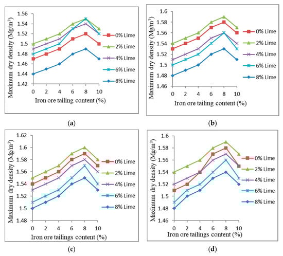 The variation of maximum dry density (MDD) of BCS–lime mixtures with IOT content for 0–3 h elapsed time after mixing is presented in Figure 7a–d. MDD value increased to a peak value at 8% IOT content and thereafter decreased at 10% IOT content. However, it was observed that MDD decreased with higher lime content. MDD values increased from 1.47 to 1.52 Mg/m3, 1.50 to 1.55 Mg/m3, 1.49 to 1.54 Mg/m3, 1.48 to 1.55 Mg/m3, and 1.44 to 1.49 Mg/m3 for 0% lime–up to 8% IOT, 2% lime–up to 8% IOT, 4% lime–up to 8% IOT, 6% lime–up to 8% IOT, and 8% lime–up to 8% IOT treatment, respectively, for 0 h elapsed time after mixing. A similar trend was noticed for 1, 2, and 3 h elapsed time after mixing. The increase in MDD recorded may be due to the possible agglomeration and flocculation of clay particles mainly caused by cation exchange and also filling of voids in the soil skeleton by the admixtures which resulted in better packing and denser material [,,]. Also, IOT with specific gravity (3.35) substituting the soil with lesser specific gravity (2.29) contributed to the development of a mixture with greater specific gravity and hence higher MDD [,].