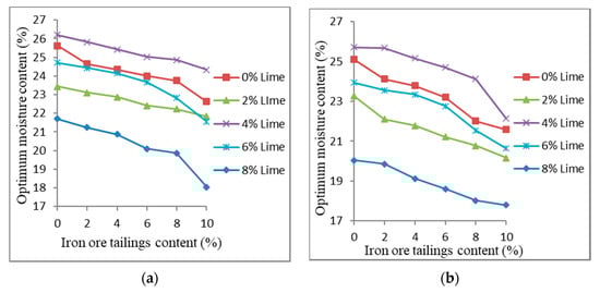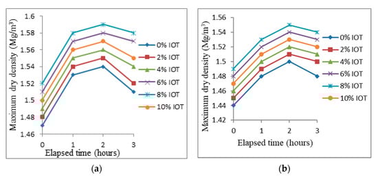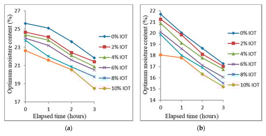 The variation of OMC with elapsed time after mixing for 0% lime–up to 10% IOT and optimal 8% lime–up to 10% IOT treatment is shown in Figure 10a,b. Generally, OMC decreased with increased elapsed time after mixing for all the lime and IOT treatments considered. The OMC values decreased from 25.62 to 21.83% for 0% lime/0% IOT and 22.63 to 18.46% for 0% lime/10% IOT. A similar trend was observed for 8% lime–up to 10% IOT treatment. The reduction in OMC with elapsed time after mixing could be attributed to the increase in the hydration products formed with time that resulted in a decrease in OMC. Also, self-desiccation where the water was used up in the hydration process could be responsible for the decrease in OMC with elapsed time before compaction [].