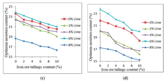 The variation of OMC of BCS–lime mixtures with IOT content for 0–3 h elapsed time after mixing is presented in Figure 9a–d. Generally, the OMC of BCS mixtures decreased with an increase in IOT content. OMC value for natural soil decreased from 25.62% to 15.20% at 8% lime/10% IOT treatment. A similar trend was recorded for other lime/IOT treatments. The decrease in OMC may be linked to enhanced cation exchange reaction due to the combination of free lime products and the IOT that resulted in decreased thickness of the double layer causing flocculation.
