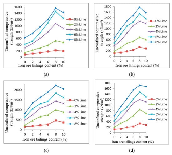 The variation of UCS of BCS–lime mixtures (seven days curing) with IOT content for different elapsed times after mixing is shown in Figure 11a–d. The UCS increased with an increase in both lime and IOT contents. For 0 h elapsed time after mixing, the UCS values increased from 84.2 to 217.2kN/m2, 153.5 to 526.6 kN/m2, 307.8 to 1071.3 kN/m2, 413.0 to 1459.1 kN/m2, and 622.1 to 1562.9 kN/m2 for 0% lime–0 up to 10% IOT, 2% lime–up to 10% IOT, 4% lime–up to 10% IOT, 6% lime–up to 10% IOT, and 8% lime–up to 10% IOT treatment, respectively. A similar trend was observed for 1, 2, and 3 h elapsed time after mixing. The improvement in UCS was probably due to the development of substances like calcium silicate hydrates (CSH), calcium aluminate hydrates (CAH), and microfabric modifications, leading to strength development [,,]. The exact products, however, varied with the kind of clay mineralogy and the reactions, including temperature, moisture, and curing conditions [,,]. This reaction continued in the presence of moisture and could have been the reason for the increase in UCS with lime and IOT content with increased elapsed time. A reduction in the UCS values at 10% IOT content for all the lime treatments was observed. The decrease in strength with the IOT content may be linked to excess IOT yielding lesser valence cations that could not be neutralized with the available greater valence cations. This reaction increased the affinity of H+ which caused a drop in strength [].