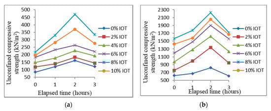 The variation of UCS of BCS with elapsed time after mixing for 0% lime–up to 10% IOT and optimal 8% lime–up to 10% IOT treatment is shown in Figure 12a,b. The UCS value increased to peak values at 2 h elapsed time after mixing and thereafter decreased at 3 h elapsed time after mixing. The UCS values increased from 84.2 to 161.6 kN/m2 for 0% lime/0% IOT and 196.8 to 369.9 kN/m2 for 0% lime/10% IOT treatment. A similar trend was observed for optimal 8% lime–up to 10% IOT treatment. The early increase in the UCS for the first 2 h may be attributed to the fact that, once compaction is delayed, hydration processes that bind particles in their loose state are formed, thereby leading to aggregations of the soil particles and hence an increase in the density of the soil, which results in increased strength []. The decrease in UCS after a 3 h delay may be due to destruction of the cementitious bonds formed during the soil–lime–IOT reaction over the period between mixing and compaction. The destruction of this matrix during compaction results in a decline in the strength of the compacted soil. Ochepo [] and Nwadiogbu [] also reported improvement in the UCS and reduction at higher lime/IOT treatment.