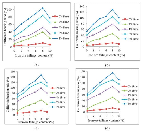 Variation of California bearing ratio (unsoaked condition) of BCS–lime mixtures with IOT content for different elapsed times after mixing: (a) 0 h, (b) 1 h, (c) 2 h, (d) 3 h.