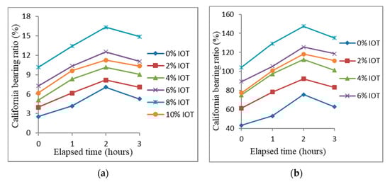 Variation of California bearing ratio of BCS with elapsed time after mixing for different treatments: (a) 0% lime–up to 10% IOT, (b) 8% lime–up to 10% IOT.