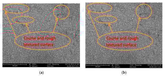 Scanning electron microscope (SEM) equipment was employed to investigate the morphology of the stabilized soil. Figure 15a,b shows the SEM results of the natural and optimal 8% lime–8% IOT-treated BCS after a seven-day curing period. From the SEM images, the natural soil has a smooth surface appearance with macropores (see Figure 15a) while the optimally treated BCS, after seven days curing, was aggregated with coarse and rough textured surface appearance. The morphology may be related to new compounds formed as a result of aggregation of the soil particles due to cation exchange, flocculation–agglomeration, pozzolanic reaction, and carbonation that took place during the curing period. The micrograph showed the development of cementitious products of calcium silicates hydrates, calcium aluminate hydrates, and calcium aluminosilicate hydrates covering the soil grains and filling up interaggregate openings. These compounds were accountable for strength gain. Similar results were reported by Mallela et al. [] as well as Deneele et al. [].